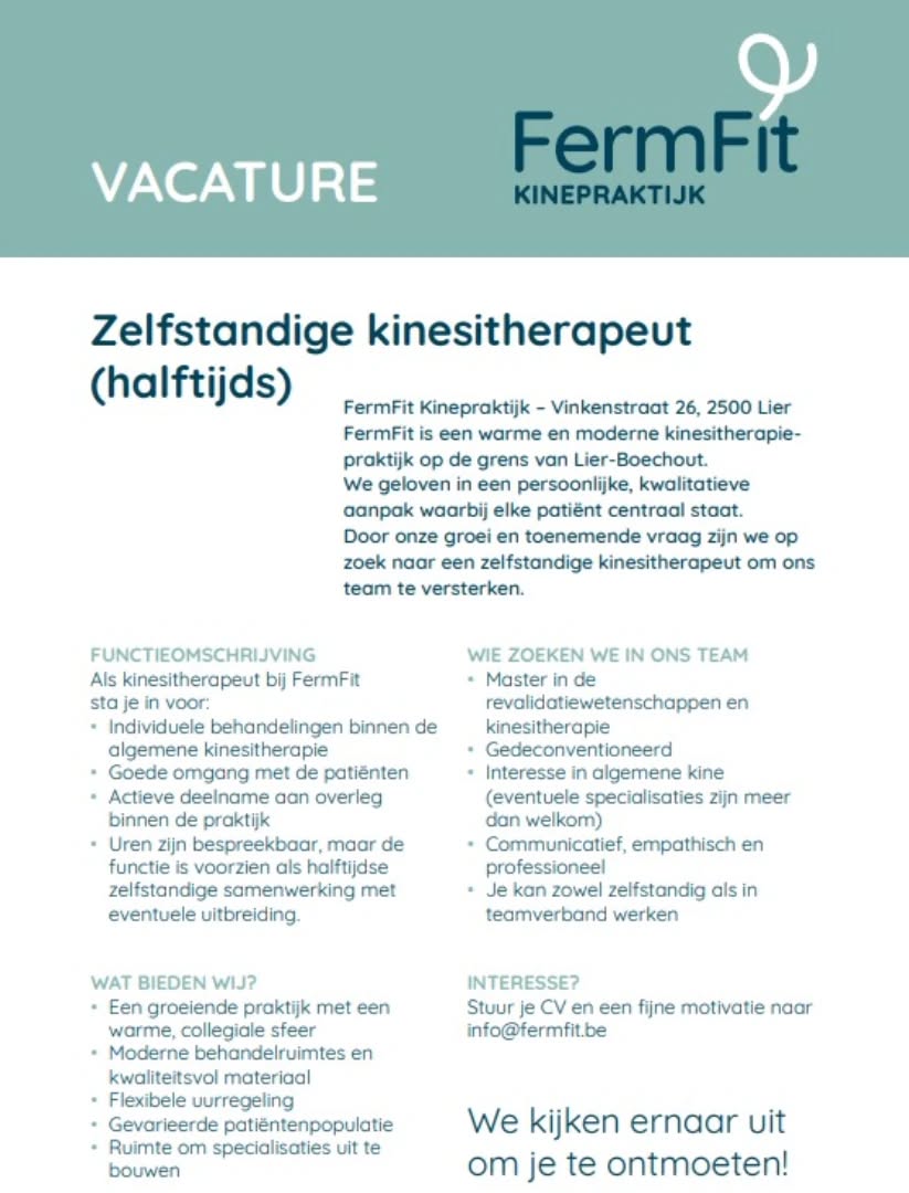 We zijn opzoek naar een zelfstandig kinesitherapeut (halftijds) om ons warm en collegiaal team te versterken.