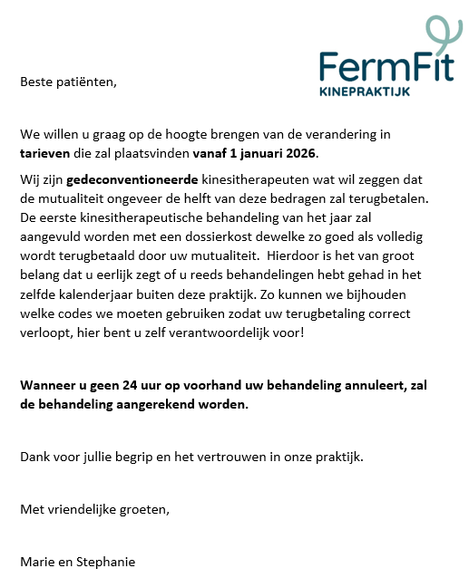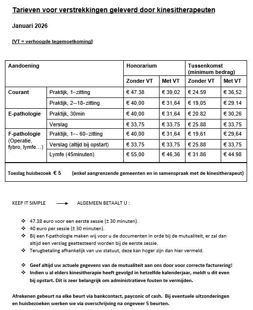 Na elke/... behandeling(en) zullen we afreken, dit kan cash, met bancontact/ payconic of via overschrijving. Nadien ontvang je van ons de nodige documenten om een terugbetaling bij de mutualiteit of verzekering te bekomen.